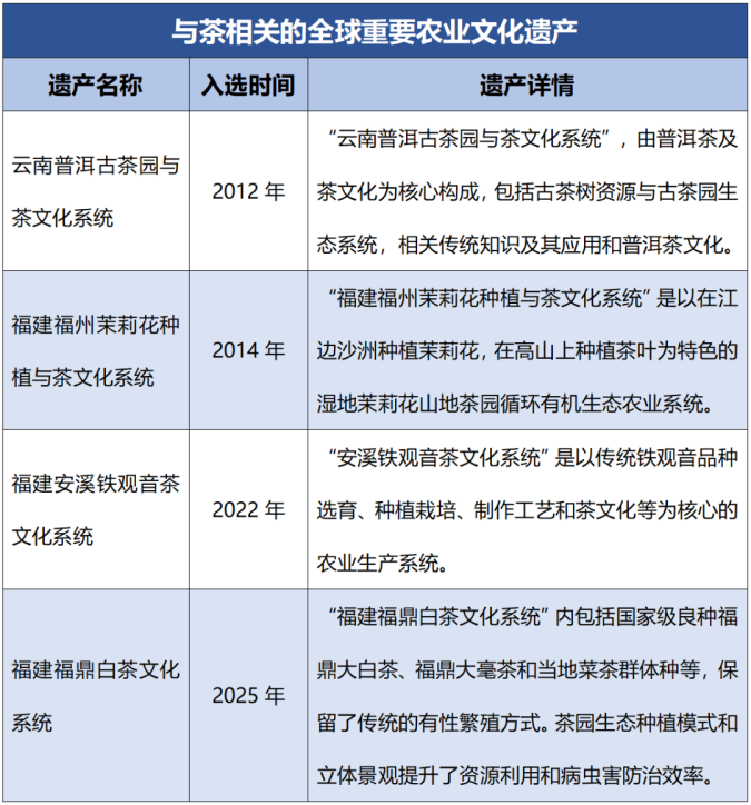 5月19日,全球重要农业文化遗产科学咨询小组在意大利罗马召开会议,来自我国的福建福鼎白茶文化系统、甘肃皋兰什川古梨园系统、浙江德清淡水珍珠复合养殖系统三项遗产系统顺利通过专家评审,正式被联合国粮农组织认定为全球重要农业文化遗产。 截至目前,我国全球重要农业文化遗产增至25项,数量继续保持世界首位,其中茶叶相关“农遗”已达4项。 ![]() △“说茶”制图 福鼎白茶文化系统位于福建省福鼎市,其独特的地理位置、气候条件和悠久历史孕育了特有的茶树品种和制茶技艺,以及深厚的文化内涵。系统内包括国家级良种福鼎大白茶、福鼎大毫茶和当地菜茶群体种等,保留了传统的有性繁殖方式。茶园生态种植模式和立体景观提升了资源利用和病虫害防治效率。 ![]() △福建福鼎白茶文化系统(图片来源:农业农村部新闻办公室) 这一文化系统丰富了世界茶叶种类和茶树繁育方式;遗产地人民发现了福鼎白茶茶树品种,至今仍保留有福鼎白茶母树,建立茶树种质资源库和“福鼎大白茶品种保护区”“老茶树群落核心保护区”,丰富了世界茶树基因库;茶树的生态种植管理模式以及当地遗产地人民长期以来对农遗守护的自觉和实践,对全球山区生态农业建设具有示范作用,为重要农业文化遗产保护与传承提供借鉴。 |