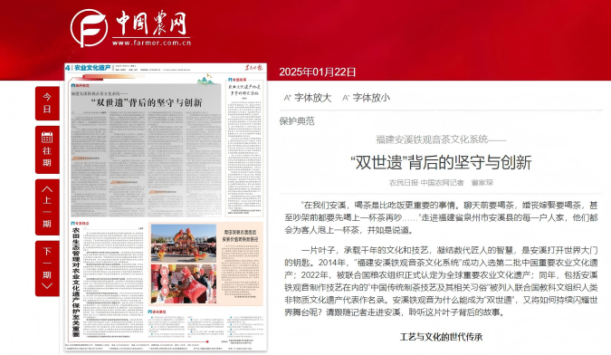 1月22日,《农民日报》农业文化遗产专刊刊发《安溪铁观音茶文化系统——“双世遗”背后的坚守与创新》。全文如下: ![]() “在我们安溪,喝茶是比吃饭更重要的事情。聊天前要喝茶,婚丧嫁娶要喝茶,甚至吵架前都要先喝上一杯茶再吵……”走进福建省泉州市安溪县的每一户人家,他们都会为客人泡上一杯茶,并如是说道。 一片叶子,承载千年的文化和技艺,凝结数代匠人的智慧,是安溪打开世界大门的钥匙。2014年,“福建安溪铁观音茶文化系统”成功入选第二批中国重要农业文化遗产;2022年,被联合国粮农组织正式认定为全球重要农业文化遗产;同年,包括安溪铁观音制作技艺在内的“中国传统制茶技艺及其相关习俗”被列入联合国教科文组织人类非物质文化遗产代表作名录。安溪铁观音为什么能成为“双世遗”,又将如何持续闪耀世界舞台呢?请跟随记者走进安溪,聆听这片叶子背后的故事。 工艺与文化的世代传承 2024年岁末,为期十余天的“百茶百戏文化周”让安溪热闹非凡。嘉宾游客与当地民众共品香茗,共赏茶戏,共探文化,乐趣十足。其间,安溪茶文化·大型主题系列情景剧《铁观音》再度演出,将安溪高甲戏、铁观音茶艺、原生态茶歌、南音等安溪特色非遗文化与声光电等舞台艺术手段融合,讲述铁观音的前世今生,展现安溪的风土人情。 科技与古法的有机融合 深冬时节的安溪依旧气温如春,郁郁青青。温和湿润的气候为茶树生长创造了得天独厚的环境,肥沃且富含有机质的土壤给了茶树充足的养分。 “要想茶叶质量好,茶园管理最为关键。茶园中的每一棵杂草都可以成为茶园覆盖原料,变成茶树的天然有机肥。每一年都要下一次农家肥、翻一次新土,新土透气性强,茶树吃到新土才能健康。”谈起生态茶园建设,大宝峰茶庄园负责人杨江根有着说不完的心得。 除了坚持传统的茶园管理方法,大宝峰茶庄园和安溪其他许多茶庄园还添了“新物件”。茶庄园入口处的大型蓝色电子屏,是安溪气象局设立的气象综合监测站,可以实时显示温度、湿度、降水量、光合有效辐射辐照度等数据,便于茶园环境监测。茶树最大的虫害是小绿叶蝉,司雷植保的声光电设备能够释放出两种振荡波,一种干扰小绿叶蝉正常进食,另一种在繁殖高峰期干扰其繁殖。杨江根表示,引入该设备后,无需使用化学农药,茶园病虫害防治效果良好。 现代科技不仅便利了茶园管理,也优化了制茶过程。据了解,在保留传统制茶核心技术前提下,安溪的茶农在摇青、揉捻过程中用电动代替手动,人工进行处理和控制,保证产品质量的同时降低了劳动强度;在烘干过程中用燃气和电代替炭火,不仅更加卫生,而且省时省力;在茶叶加工过程中,通过人工调节温度和湿度构建制茶的“微环境”,以克服不良天气对于茶叶品质的影响。 近几年来,安溪县农业农村局、福建省农业科学院和禅心缘(福建)茶业股份有限公司政、研、企合作,进行了非遗技艺数字化传承的首次尝试,利用大数据、人工智能、数字孪生等技术让铁观音制茶技艺的储存和模拟成为可能。 “铁观音制作技术的核心,总结出来虽然只有‘看天做青、看青做青’这八个字,却蕴含着各种因子的千变万化,师傅很难用语言教授给徒弟,更多的是靠徒弟的悟性。”安溪县茶业管理委员会办公室主任陈志明介绍,“我们建设了乌龙茶智能工厂,召集了多位铁观音制茶大师在装有数据采集装备的人工控制自动化、连续化制茶设备上制作茶叶,并对制作手法、影响茶叶发酵相关指标等进行数据采集。项目目前还处于前期的数据采集阶段,随着未来采集数据量的增加,数学建模会越来越准确。这样不仅能够将每位大师的制作手法保留下来,也能实现乌龙茶制作全程数字化、自动化控制,最大限度还原大师手法。” 安溪与世界的重要连接 泉州,是联合国教科文组织认定的中国古代“海上丝绸之路”的起点。一千多年前,安溪茶文化便通过“海上丝绸之路”向世界各地传播,英语、法语、德语等语言中“茶”的发音均来自闽南方言。安溪铁观音也见证了中国与西方国家文化交流的历史。 如今,安溪铁观音越来越多地出现在重要国际场合,作为国礼赠送给各国领导人,安溪茶艺节目也在全球多国展演……“双世遗”安溪铁观音,正在被世界上越来越多的人所认识。 在安溪铁观音女茶师非遗传习所的影响下,国际茶友牵头成立了北美安溪铁观音女茶师非遗传习工作站。据何环珠介绍,如今,女茶师传习所已在国内外设立二十余个传习基地,为全球茶友搭建了共同学习和传承非遗技艺的平台。 “女茶师传习所国际化进程如桥梁,联结世界茶文化与安溪铁观音。它不仅拓宽女茶师舞台,更促进全球茶文化融合。秉承世界女茶师非遗文化创新联盟宗旨,以茶筑美好生活,以产业促共同富裕,以科技赋能可持续发展,共筑以茶为媒的生命共同体。”何环珠说,“在这里,国际友人不仅学习到了精湛的茶艺技能,更被安溪铁观音独特的韵味与背后的文化故事深深吸引,女茶师不只成为了铁观音非遗文化IP,更肩负起海外宣传的责任。” 有着“中国茶都”之称的安溪,不仅把优质的安溪铁观音茶叶和茶文化传播出去,还吸引中国乃至世界各地的游客走进安溪。2024年上半年,全县接待国内旅游人数445.34万人次,同比增长17.3%。“一带一路”国家农业文化遗产管理与保护研修班