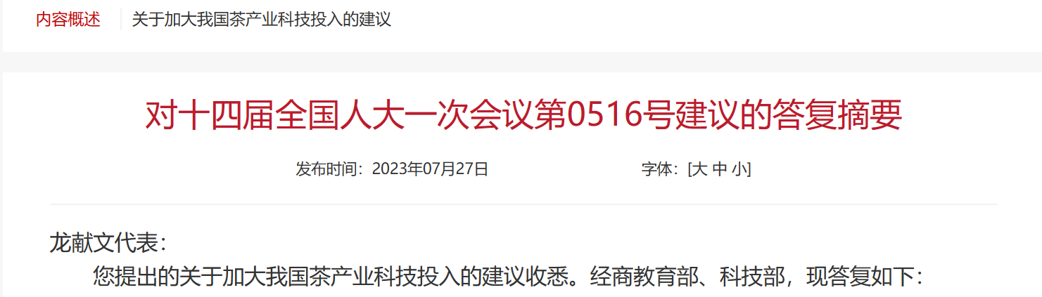 事件 2 ![]() ❒ 农业农村部提出将围绕茶产业发展需求开展有关工作 7月27日,农业农村部发布《对十四届全国人大一次会议第0516号建议的答复摘要》。其中指出,下一步,农业农村部将围绕茶产业发展需求开展有关工作。提出加强各类茶园作业机具研发力度,继续完善茶叶全产业链高质量发展标准体系;继续加大茶产业科技投入;持续优化职业教育专业布局,加快发展茶产业所需的新兴和紧缺专业等工作规划。 来源:农业农村部