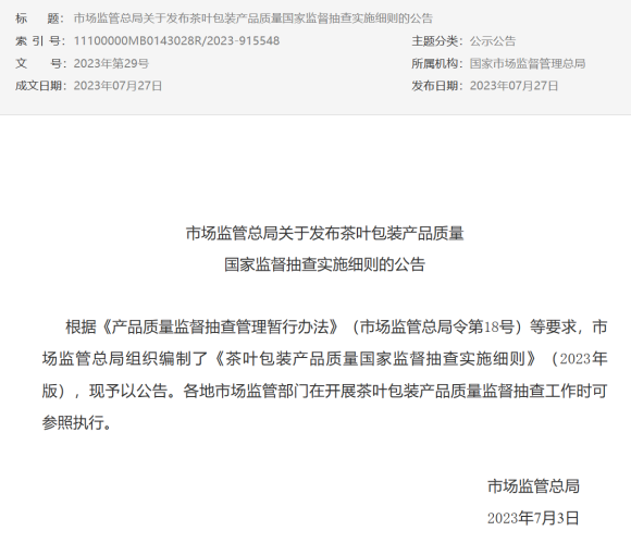 事件 3 ![]() ❒ 市场监管总局发布《茶叶包装产品质量国家监督抽查实施细则》 7月27日,国家市场监督管理总局发布《茶叶包装产品质量国家监督抽查实施细则》,《细则》涉及抽样方法、检验依据、判定规则及附则等四项内容。明确了直接接触茶叶的塑料包装、纸包装、金属包装的检验项目和检验方法。 来源:国家市场监督管理总局