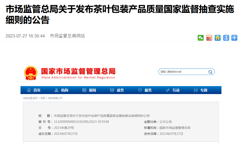 近日,国家市场监督管理总局发布了《茶叶包装产品质量国家监督抽查实施细则》。实施细则明确了直接接触茶叶的塑料包装、纸包装、金属包装的检验项目和检验方法。 据悉,2023年9月1日,《限制商品过度包装要求 食品和化妆品》(GB23350-2021)强制性国家标准将正式实施。当下《茶叶包装产品质量国家监督抽查实施细则》进一步给出了判定规则和判定原则,值得行业保持高度关注。 ![]() 文件原文如下: 市场监管总局关于发布茶叶包装产品质量 国家监督抽查实施细则的公告 根据《产品质量监督抽查管理暂行办法》(市场监管总局令第18号)等要求,市场监管总局组织编制了《茶叶包装产品质量国家监督抽查实施细则》(2023年版),现予以公告。各地市场监管部门在开展茶叶包装产品质量监督抽查工作时可参照执行。 市场监管总局 2023年7月3日