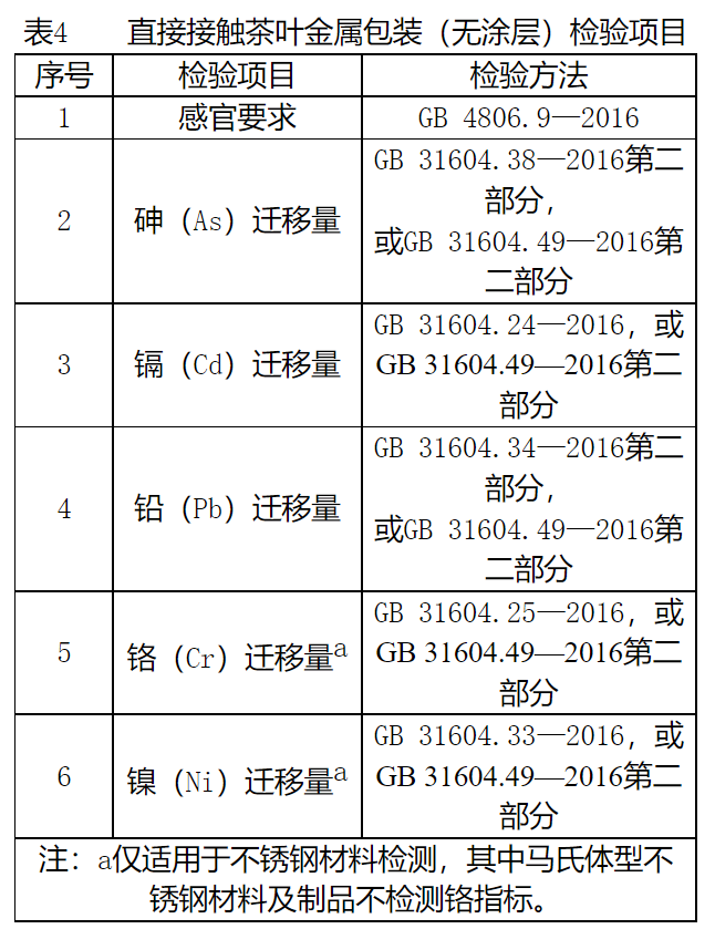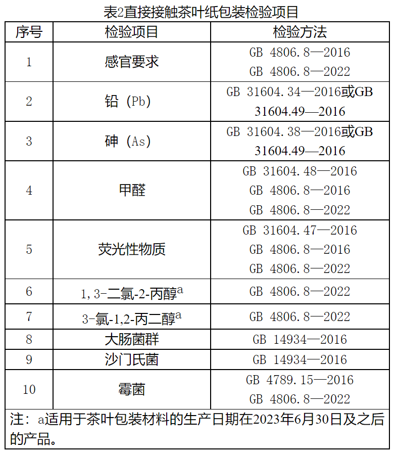 茶叶包装产品质量国家监督抽查实施细则 (2023年版) 1 抽样方法 以随机抽样的方式在被抽样生产者的待销产品中和辅料仓库内抽取。 抽查样品基数满足抽样数量即可。 随机数一般可使用随机数表、骰子或扑克牌等方法产生。 直接接触茶叶包装产品:对于茶叶包装塑料材质膜类产品,每批次产品抽取样品2卷,将每卷膜外层除去2m,每卷膜各抽取1.0㎡×2,平均分为2份,其中1份作为检验样品,1份作为备用样品;对于塑料袋类产品,每批次产品抽取2箱,每箱中各抽取30个×2,平均分为2份,其中30个×2作为检验样品,30个×2作为备用样品。 对于茶叶包装用纸产品,每批次产品抽取150张(片、只),其中100张(片、只)作为检验样品,50只作为备用样品。若产品最小销售包装为密封包装且每包数量不是50张(片、只),为避免抽样时破坏原包装,可适当调整抽样数量,保证检样不少于100张(片、只),备样不少于50张(片、只)。每批次产品抽查样品总质量应不少于300g,其中检样、备样按比例2:1抽取;对于茶叶包装用纸袋类产品,每批次产品抽取60只。其中40只作为检验样品,20只作为备用样品。(若样品过小、过大时,应调整抽样量满足总质量不少于300g,其中检样、备样按比例2:1抽取。 对于茶叶金属罐产品(有涂层),每批次抽25个,其中15个作为检验样品,10个作为备用样品;对于茶叶金属罐产品(无涂层),每批次抽10个,其中6个作为检验样品,4个作为备用样品。 以上所抽取同类样品保证同一批次,同一规格型号。 除以上抽样要求外,在茶叶成品库抽取茶叶产品对是否涉及过度包装情况进行检查,每批次产品抽取样品2盒,其中1盒作为检查样品,1盒作为备用样品。 2 检验依据 ![]() ![]() ![]() ![]() 执行企业标准、团体标准、地方标准的产品,检验项目参照上述内容执行。 3 判定规则 3.1 依据标准 GB 4806.7—2016食品安全国家标准 食品接触用塑料材料及制品 GB 4806.8—2016食品安全国家标准 食品接触用纸和纸板材料及制品 GB 4806.8—2022食品安全国家标准 食品接触用纸和纸板材料及制品 GB 4806.9—2016食品安全国家标准 食品接触用金属材料及制品 GB 4806.10—2016食品安全国家标准 食品接触用涂料及涂层 现行有效的企业标准、团体标准、地方标准及产品明示质量要求 3.2 判定原则 经检验,检验项目全部合格,判定为被抽查产品所检项目未发现不合格;检验项目中任一项或一项以上不合格,判定为被抽查产品不合格。 若被检产品明示的质量要求高于本细则中检验项目依据的标准要求时,应按被检产品明示的质量要求判定。 若被检产品明示的质量要求低于本细则中检验项目依据的强制性标准要求时,应按照强制性标准要求判定。 若被检产品明示的质量要求低于或包含本细则中检验项目依据的推荐性标准要求时,应以被检产品明示的质量要求判定。 若被检产品明示的质量要求缺少本细则中检验项目依据的强制性标准要求时,应按照强制性标准要求判定。 依据GB 4789.1—2016《食品安全国家标准 食品微生物学检验 总则》第7.3条规定“检验结果报告后,剩余样品和同批产品不进行微生物项目的复检”,微生物指标不合格不进行复检。 依据GB 23350《限制商品过度包装要求 食品和化妆品》对茶叶产品是否涉及过度包装情况进行检查,检测结果和相关证据可以作为查处茶叶过度包装的初步证据,应及时移送属地市场监管部门处理。 4 附则 依据现行有效的GB 23350《限制商品过度包装要求 食品和化妆品》发现茶叶过度包装初步证据的,及时报送属地省级市场监管部门,同时抄报市场监管总局质量监督司。 本细则首次发布。