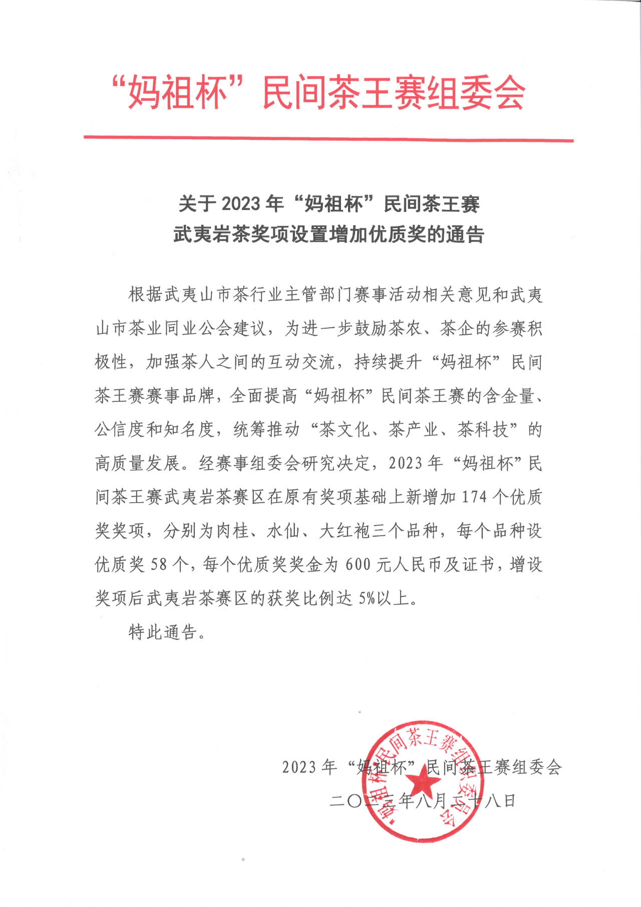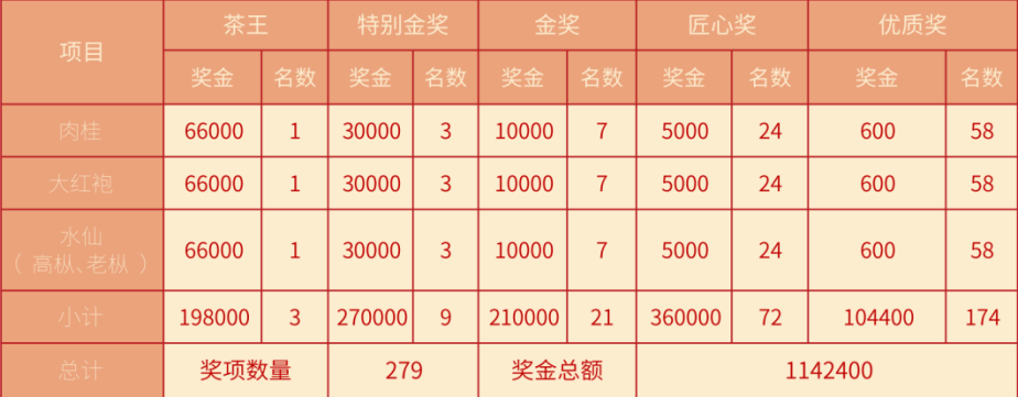 根据武夷山市茶行业主管部门赛事活动相关意见和武夷山市茶业同业公会建议,为进一步鼓励茶农、茶企的参赛积极性,加强茶人之间的互动交流,持续提升“妈祖杯”民间茶王赛赛事品牌,全面提高“妈祖杯”民间茶王赛的含金量、公信度和知名度,统筹推动“茶文化、茶产业、茶科技”的高质量发展。经赛事组委会研究决定,2023年“妈祖杯”民间茶王赛武夷岩茶赛区在原有奖项基础上新增加174个优质奖奖项,分别为肉桂、水仙、大红袍三个品种,每个品种设优质奖58个,每个优质奖奖金为600元人民币及证书,增设奖项后武夷岩茶赛区的获奖比例达5%以上。