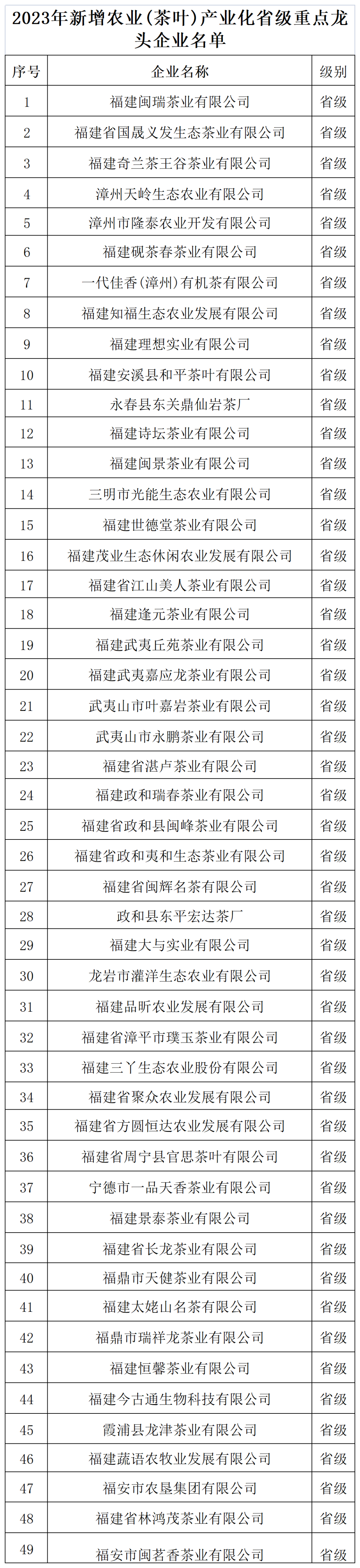 // 祝贺闽瑞茶业有限公司、国晟义发生态茶业有限公司、奇兰茶王谷茶业有限公司等茶企荣获农业产业化省级重点龙头企业。希望这些茶企继续发展壮大,以更卓越的能力,为我国茶产业的发展贡献更多力量!