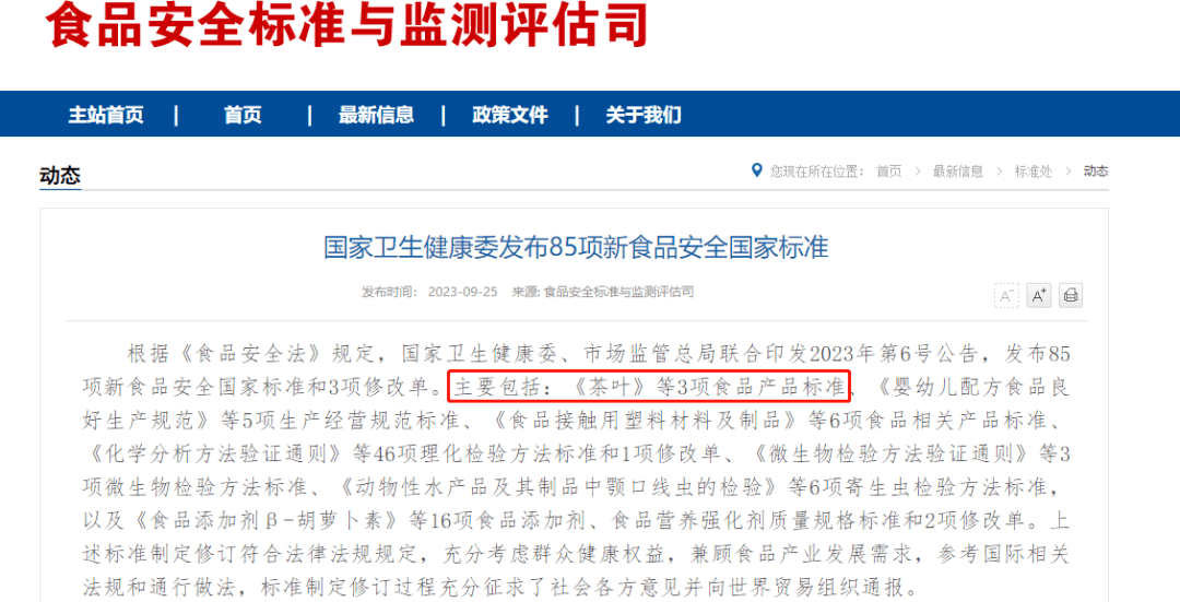 事件 1 ![]() ❒ 《食品安全国家标准 茶叶》(GB 31608-2023)发布