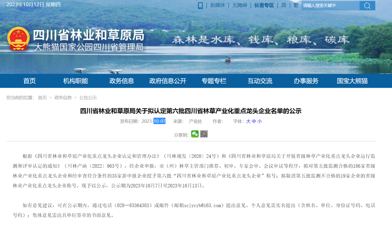 10月7日,四川省林业和草原局对第六批四川省林草产业化重点龙头企业名单进行公示。第五批监测合格的186家省级林业产业化重点龙头企业和经审查符合条件的35家新申报企业被授予第六批“四川省林业和草原产业化重点龙头企业”称号,其中,四川米仓山茶业集团有限公司、宜宾川红茶业有限公司、四川森林茶业有限公司三家茶企入选。 来源:四川省林业和草原局