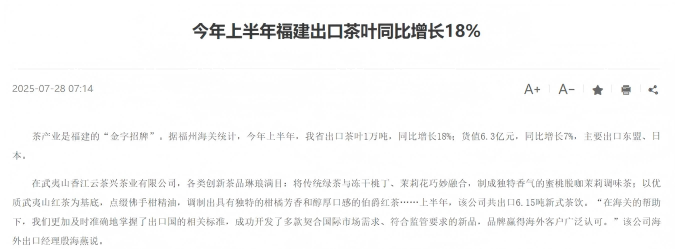 茶产业是福建的“金字招牌”。据福州海关统计,今年上半年,福建省出口茶叶1万吨,同比增长18%;货值6.3亿元,同比增长7%,主要出口东盟、日本。 ![]() △(图片来源:福建省人民政府官网)