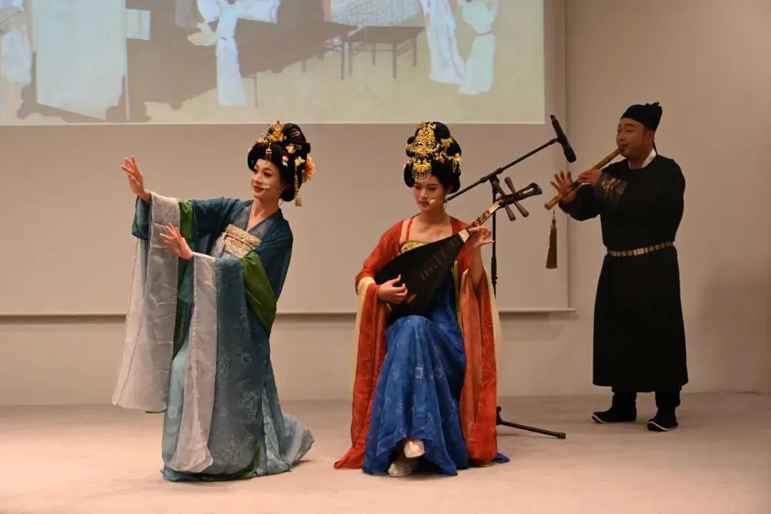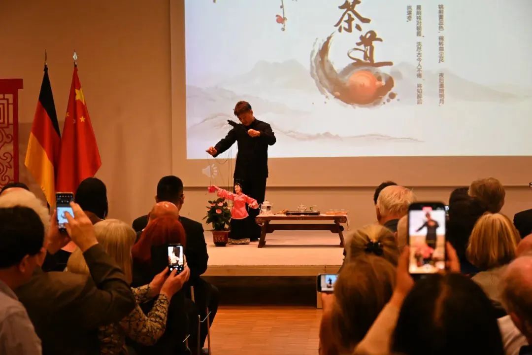 演出: 艺术荟萃打动柏林观众 开幕式上,丰富多彩的舞台表演将现场气氛推向高潮。福建南音悠扬典雅,被誉为“中国古代音乐的活化石”,洞箫演奏者与两位弦乐师仪表端庄,乐声舒缓从容,如雨打芭蕉,如月下赏梅,传递着东方文化中 “慢下来、品韵味”的审美追求。沙画表演以流动唯美的画面讲述丝绸之路千年浪漫故事,舞蹈《白瓷飘香》《梦·千年》《龙舞·愿》以细腻舞姿诠释东方美学。川剧变脸以其出神入化的技艺震撼全场,木偶剧《沏茶》则通过生动表演将泡茶的雅趣娓娓道来,引发观众掌声不断。整场演出内容丰富、形式多样,彰显中华文化的艺术魅力。 △福建南音
