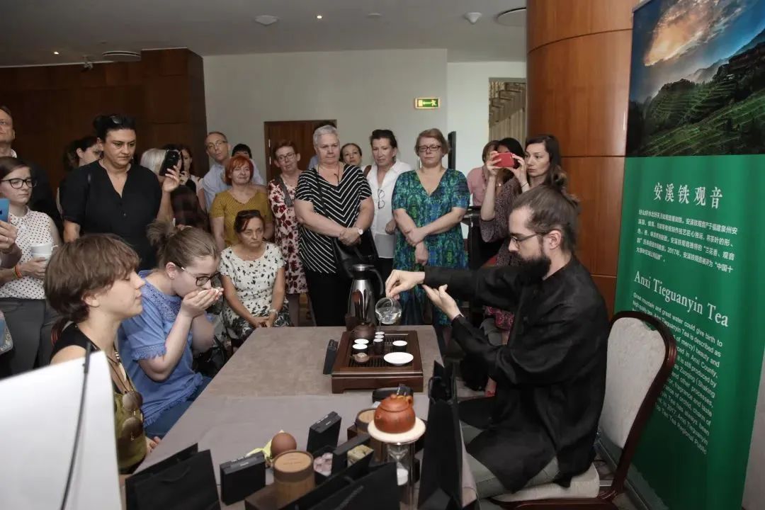△2019年“闽茶海丝行”波兰站,波兰的功夫茶爱好者现场表演中国茶道。2013年“闽茶世界行”在美国纽约启动至今(2016年更名为“闽茶海丝行”),足迹已遍及德国、波兰、捷克、英国、法国、西班牙、希腊、俄罗斯、匈牙利等欧洲国家,以及新加坡、马来西亚、印度尼西亚、哈萨克斯坦、印度等亚洲国家,还走进了香港特别行政区,在境外主要城市成功设立了16个闽茶文化推广中心,其影响力已辐射全球50多个国家和地区。(来源:《茶道》杂志) 福建是产茶大省,茶文化源远流长,茶不仅是特色产业,更是福建的一张亮丽名片。过去的一年,福建茶产业在“三茶”统筹发展理念的指引下,取得了丰硕成果。2024年全省茶园面积378.3万亩,产量57.5万吨,年产值1800亿元。茶文化传承创新、茶产业提质增效、茶科技突破升级的协同效应日益凸显。茶科技与茶文化深度融合,武夷山打造“茶宴、茶宿、茶径”新业态,龙岩永福樱花茶园以“茶绿樱红”年吸引游客超百万,实现“茶园变景区、茶山变金山”。