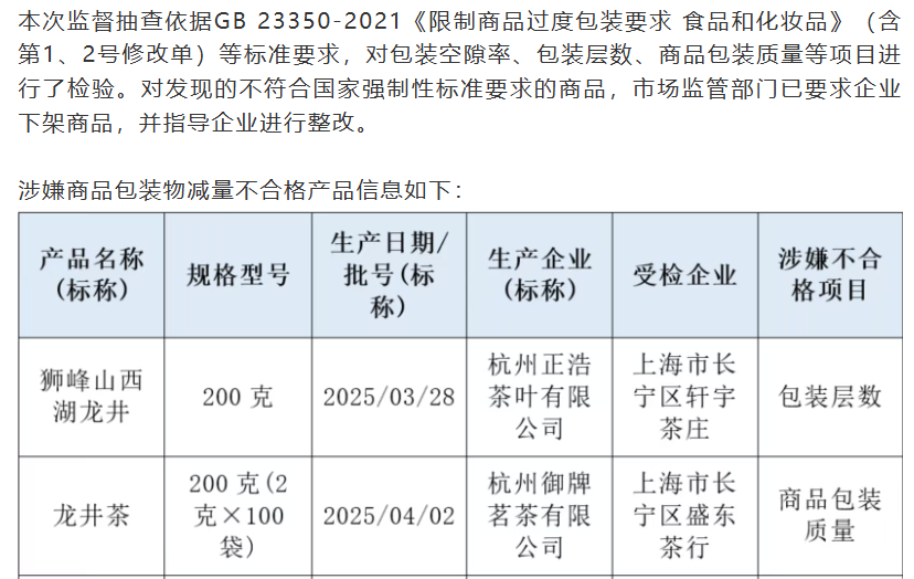 ❒ 上海市场监管局抽检茶叶过度包装 近期,上海市市场监督管理局对上海市生产领域和流通领域(含电商平台)的茶叶开展商品包装物减量(过度包装)监督抽查,共抽样并完成检验151批次,其中合格135批次,16批次涉嫌不合格,不合格发现率10.6%。来源:上海市场监管 事件3