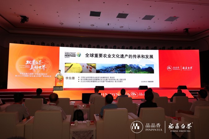 ![]() 中国农科院农业经济与发展研究所研究员、联合国粮农组织全球重要农业文化遗产科学咨询小组前副主席李先德以《全球重要农业文化遗产的传承和发展》为题,结合全球农遗标准与福鼎实践,指出“福建福鼎白茶文化系统”的核心特征,提出保护端需守护茶树种质、传统技艺与习俗;发展端要打造高端特色产品、探索茶文旅融合,并构建“政府-企业-合作社-茶农”多方利益共享机制,保障福鼎白茶可持续发展。