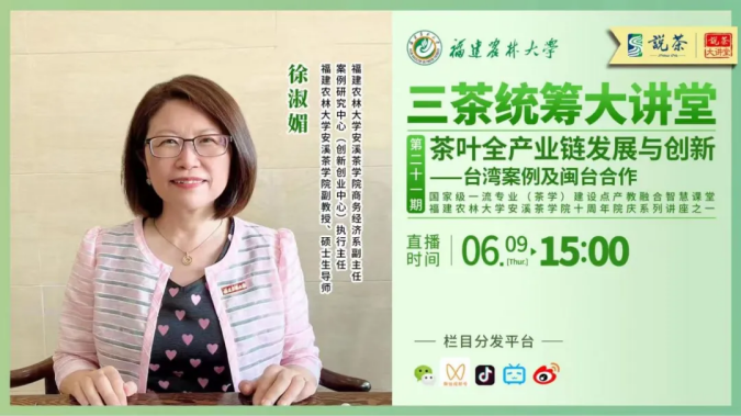 近日,福建农林大学安溪茶学院商务经济系副主任、案例研究中心(创新创业中心)执行主任、福建农林大学安溪茶学院副教授、硕士生导师徐淑媚老师走进说茶直播间,开展了一场《茶叶全产业链发展与创新—台湾案例及闽台合作》主题讲座,从台湾的茶叶种植、观光茶园、茶产业的创新经营三个方面,带大家探讨茶叶全产业链的发展和创新。 ![]() 01 台湾茶园种植面积大约有21554公顷,主要分布在台湾北部和中部地区。分为北部茶区、桃竹苗茶区、中南部茶区、东部茶区、高山茶区。