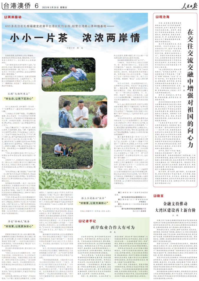3月26日,《人民日报》刊登了漳平市《600多名台农扎根福建龙岩漳平台湾农民创业园,经营台湾高山茶种植基地——小小一片茶 浓浓两岸情》文章。详情如下: ![]() 初春的清晨,闽西南的山间云雾缭绕,一垄垄翠绿的茶树层层叠叠,错落有致,引来许多游人拍照打卡。这让谢东庆心里美滋滋的。