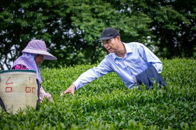 谢东庆出生在台湾彰化,是最先到福建漳平投资茶园的台农。在他的带动下,一批批台农跨越海峡来到漳平,在这片热土上种下一棵棵茶树,也绘就了一幅幅两岸农业交流合作的画卷。 ![]() △浙江台农谢东庆(右一)在指导当地茶农采茶。漳平台湾农民创业园管委会供图