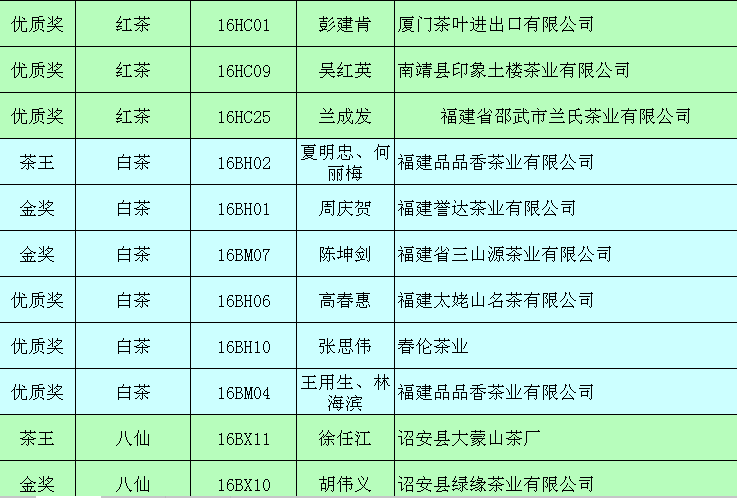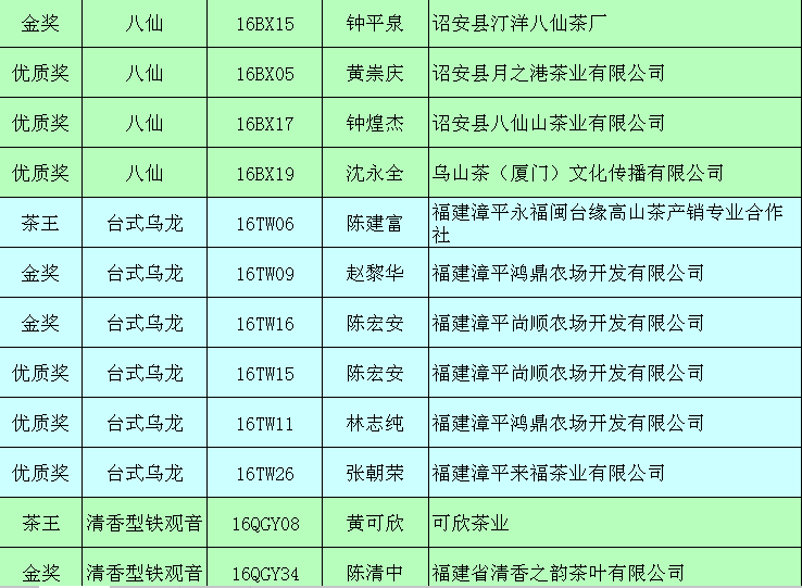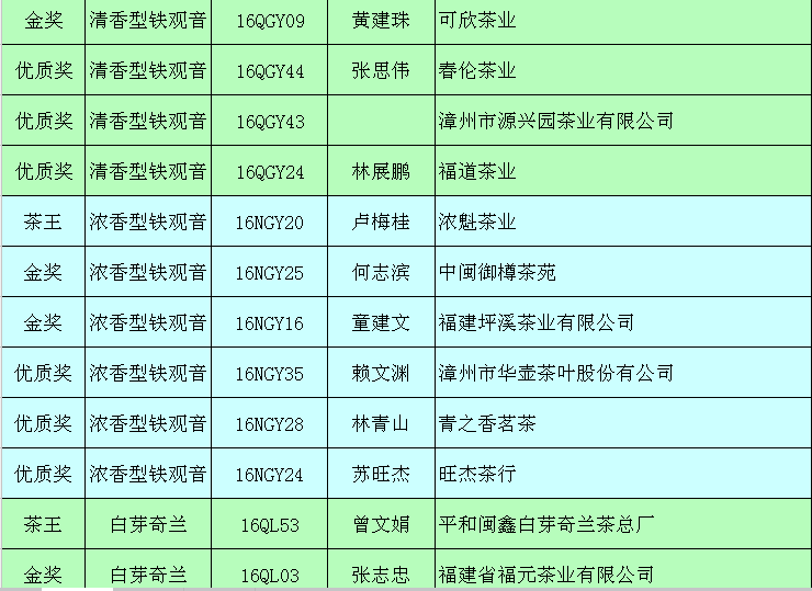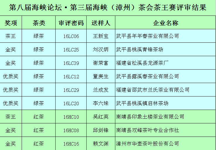 此次茶王赛是第八届海峡论坛·第三届海峡(漳州)茶会的重要配套内容,选自福建各地的三百多份茶样参与评审,种类分别为红茶、绿茶、白茶、闽南乌龙茶(铁观音、白芽奇兰、八仙)、台式乌龙。经过专家的严格密码评审,评选结果已经出炉。据悉,第八届海峡论坛·第三届海峡(漳州)茶会将于6月11--13日在漳州花都举办,届时将在开幕式上进行茶王赛颁奖典礼。