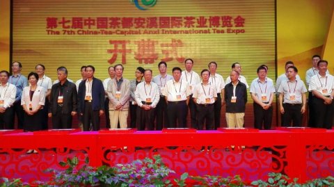 开幕式上,主礼嘉宾分别拿起第七届中国茶都安溪国际茶业博览会字牌,嵌入启动台,为茶博会隆重启幕。