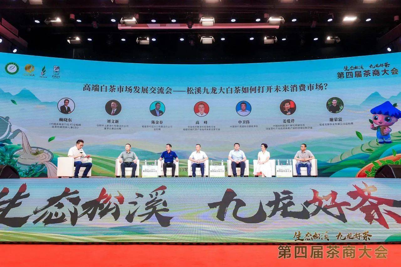 步履不停 趁势而上 松溪县抢抓茶业发展机遇 活动现场,《松溪九龙大白茶白皮书》与《松溪茶志》正式发布,将“史诗级”的岁月写进书中,串联起产区记忆与怀旧情怀,诉说松溪茶业发展“传奇”。 为促进松溪茶业、茶旅融合发展,推动茶产业转型升级,开拓市场,闽北茶产业职工之家联盟授牌、授信仪式,松溪县人民政府与福建农业职业技术学院、杭州龙冠实业有限公司签订合作协议,松溪茶企与采购商签订采购合同,“2023美丽中国茶乡行·游在松溪”启动仪式等多个环节同步进行。 大会现场,松溪县政府还公布第一批“松溪九龙大白茶”商标使用许可企业名单,为构建松溪茶业良好、可持续性发展局面助力。 活动期间,福建品品香茶业有限公司董事长林振传以自身独到的品牌打造经验,为松溪九龙大白茶品牌发展献计献策。杭州龙冠实业有限公司副总陈瑞鸿为大家推介“冠·银针”九龙大白茶系列产品。松溪九龙大白茶福州推广中心黄万祖讲述松溪九龙大白茶在高端白茶市场上的推广举措。熹茗集团有限公司总经理圣键总结熹茗集团助力松溪茶产业发展之举。福建湛峰茶业有限公司经理叶益珍介绍湛峰茶业运用“公司+基地+农户”的经营模式,带动当地茶农增收致富。 绿色 高端 可持续 探究白茶市场风向标 多维度视角,探究白茶持续高质量发展。大会现场同步举行高端白茶市场发展交流会,旨在深度剖析中国白茶绿色、高端发展趋势,讲述高端白茶品牌发展逻辑与市场定位,从而延伸白茶市场价值。高端白茶市场发展交流会由中国茶叶流通协会秘书长肖星主持。