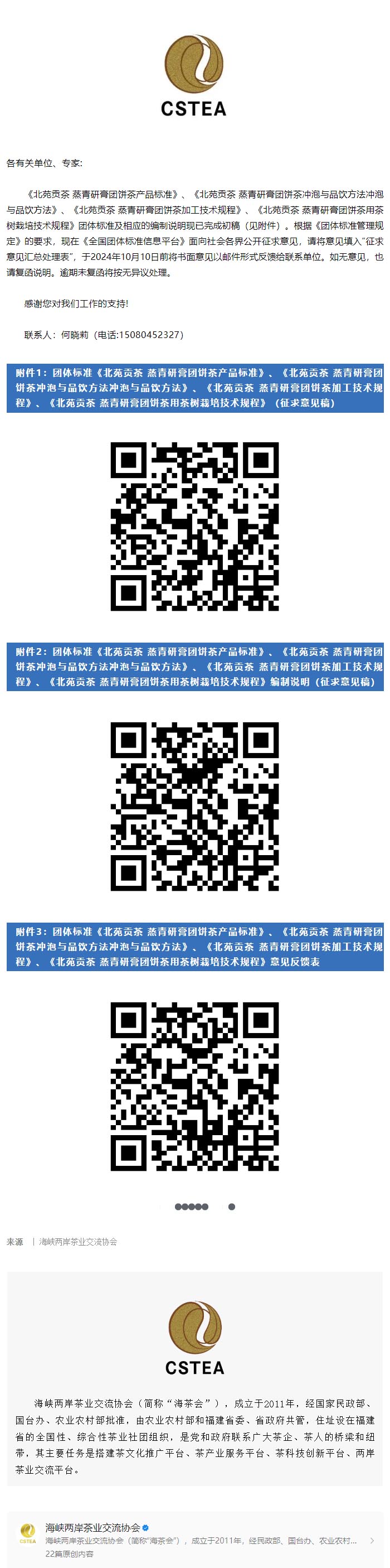 关于对《北苑贡茶 蒸青研膏团饼茶产品标准》等系列团体标准(征