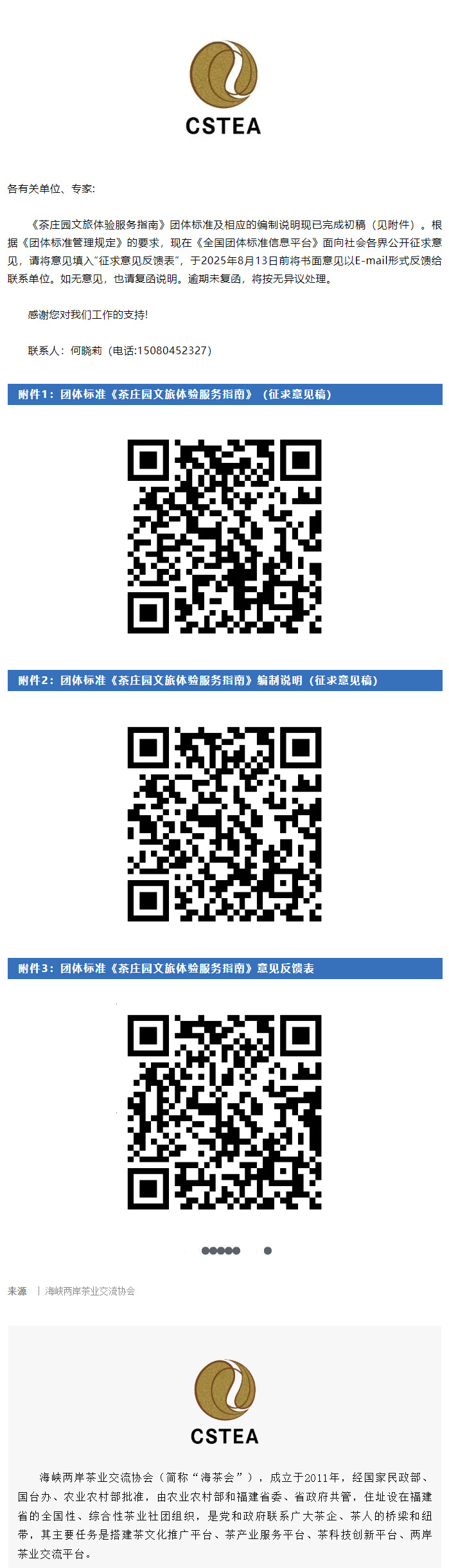 关于对《茶庄园文旅体验服务指南》团体标准(征求意见稿)征求意
