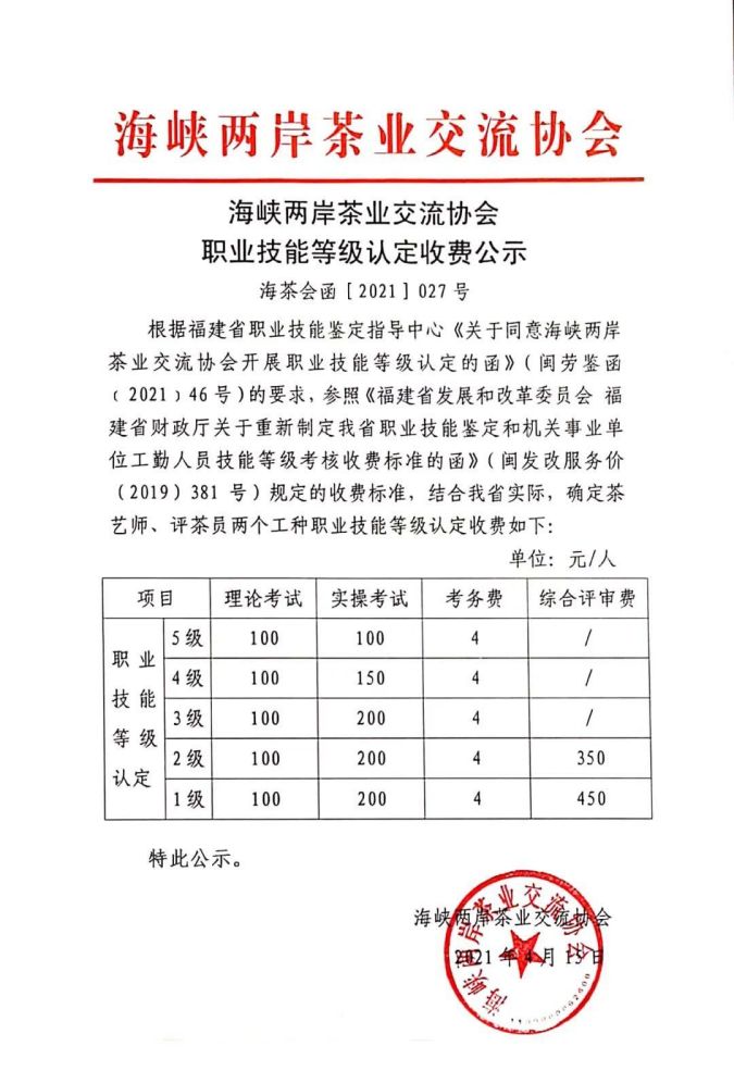 结合有关规定的要求和收费标准,海峡两岸茶业交流协会关于茶艺师、评茶员两个工种职业技能等级认定收费标准已确定,
